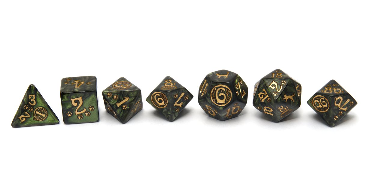 This dice set consists of 7 polyhedrons with digits kept in a feline font style, and you will find no less than 3 variations of their faces! Some show cat's paws trails, other have a ball of tarn, and the highest ones depict cats in person, just doing their feline things!