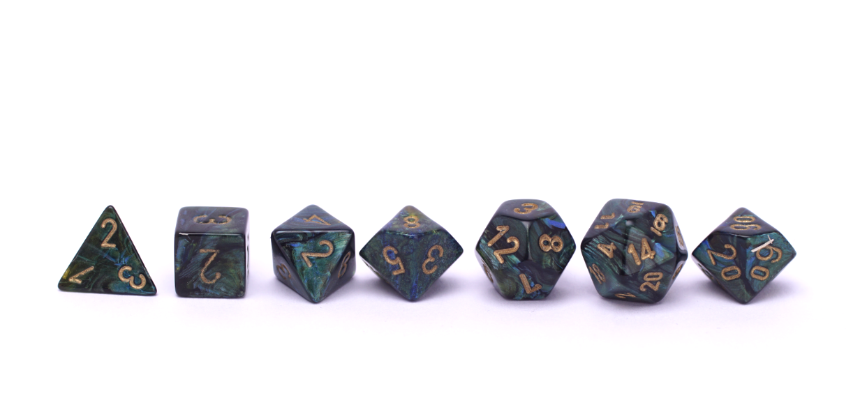 An intriguing dark green mini dice polyset with flecks of blue and an oily appearance.