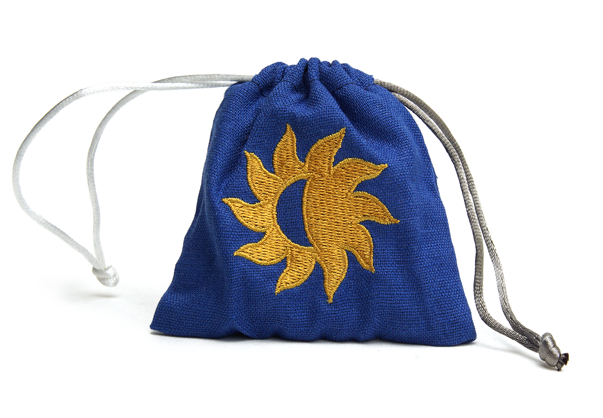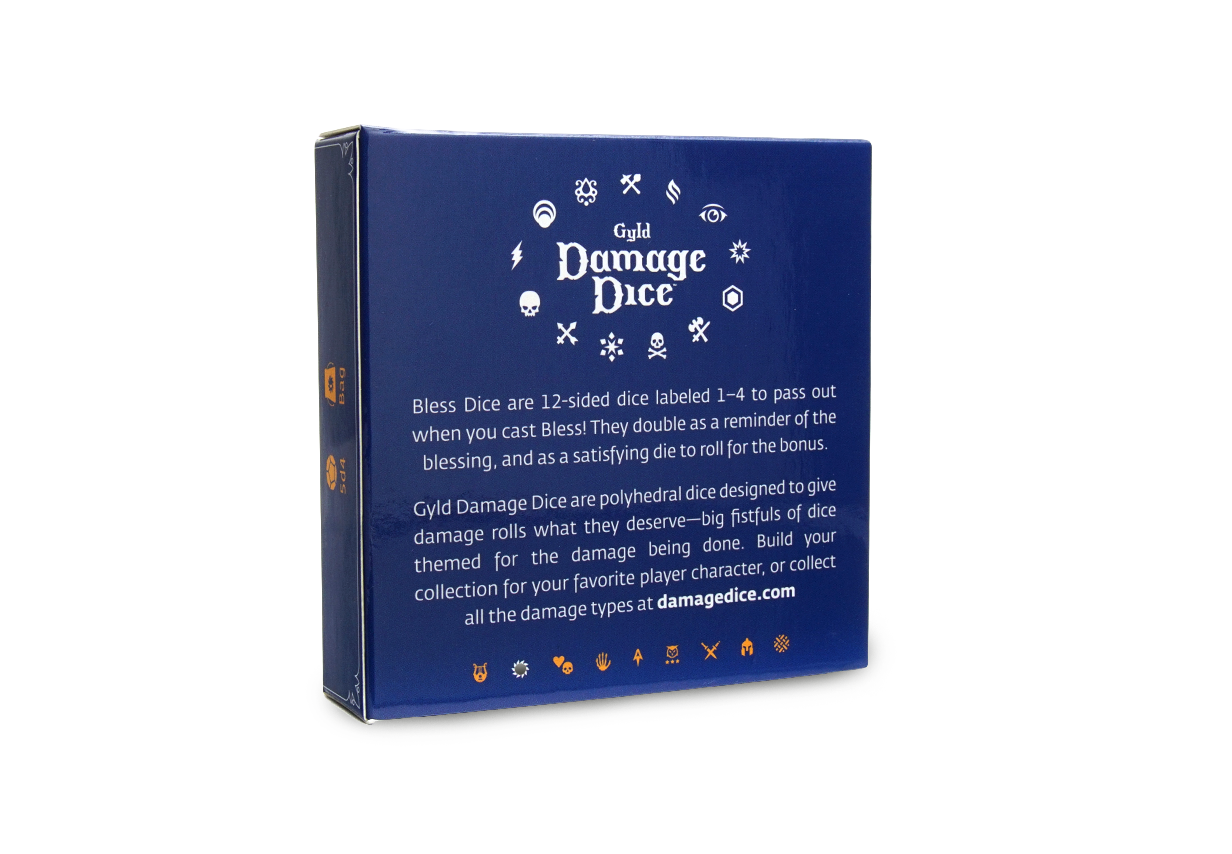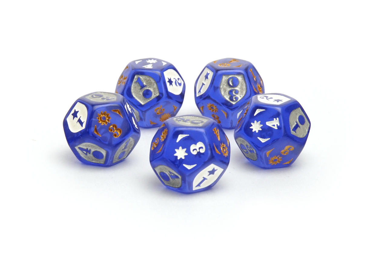 Support your allies with these dazzling dice of blessing, translucent blue d12s with both white and gold inking. Pass them around when you cast bless!