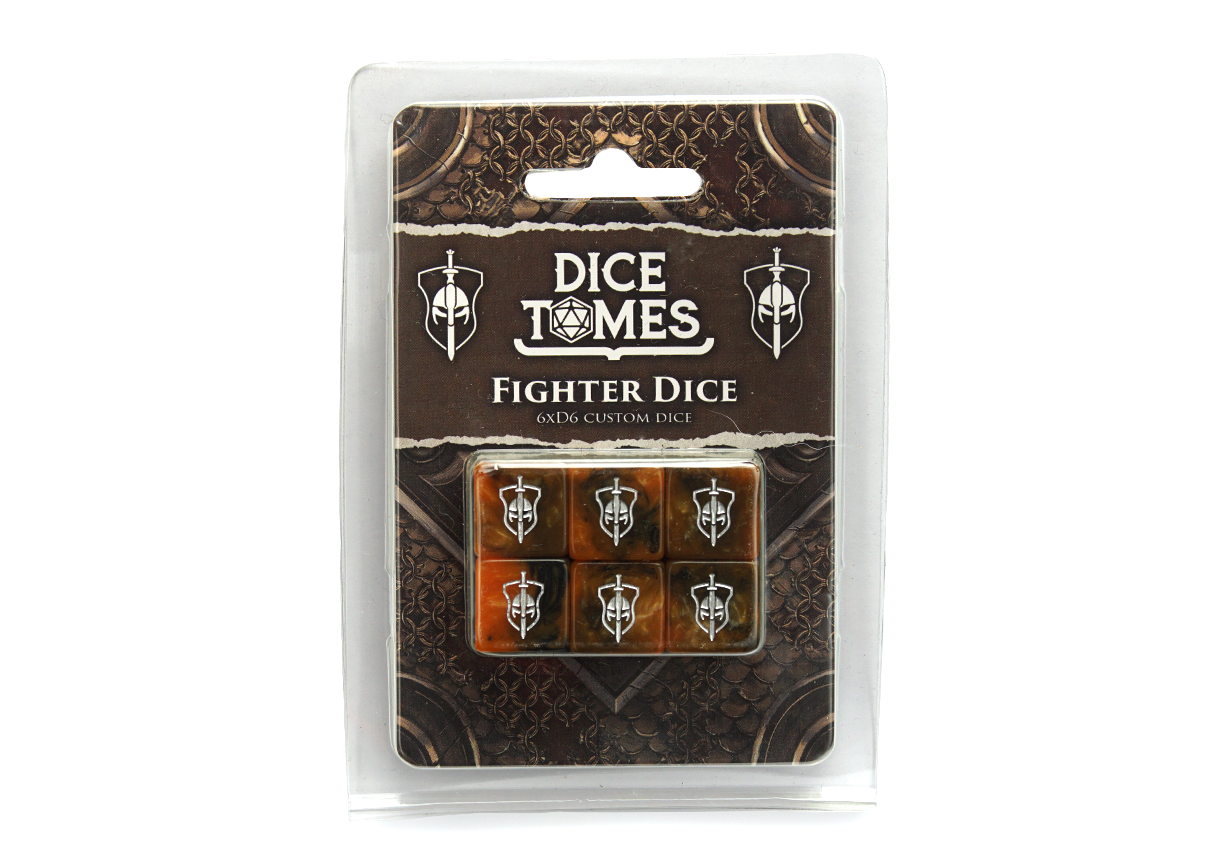 Consider this intimidating set of specialised D6 dice, with their fiery orange and smoky black aesthetic and steel silver ink finishing their warrior motifs and numerical values.