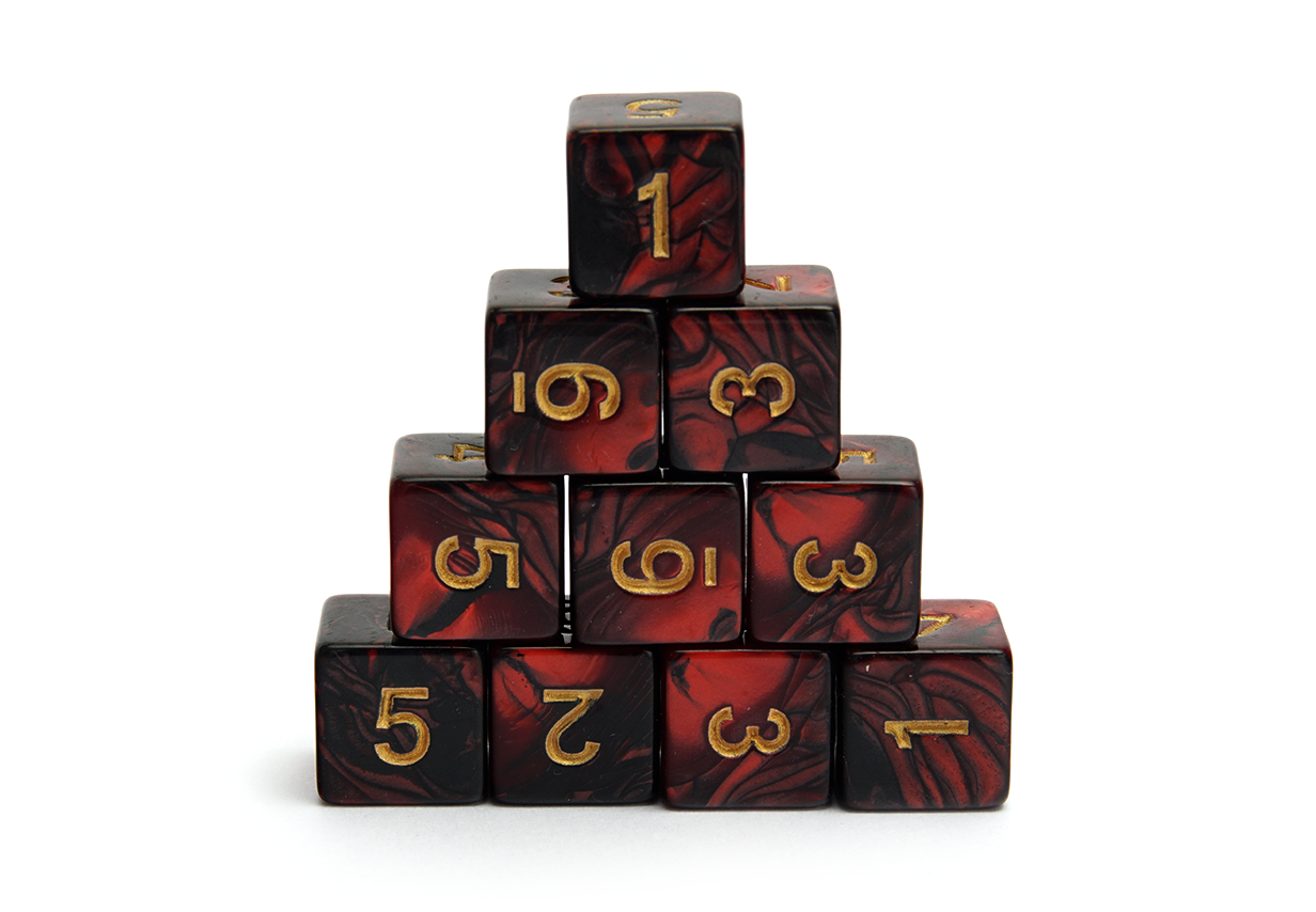 A block of fine six-sided dice, with written numbering instead of pips. Deep blood reds swirling amongst abyssal blacks, emblazoned with sharp golden inking.