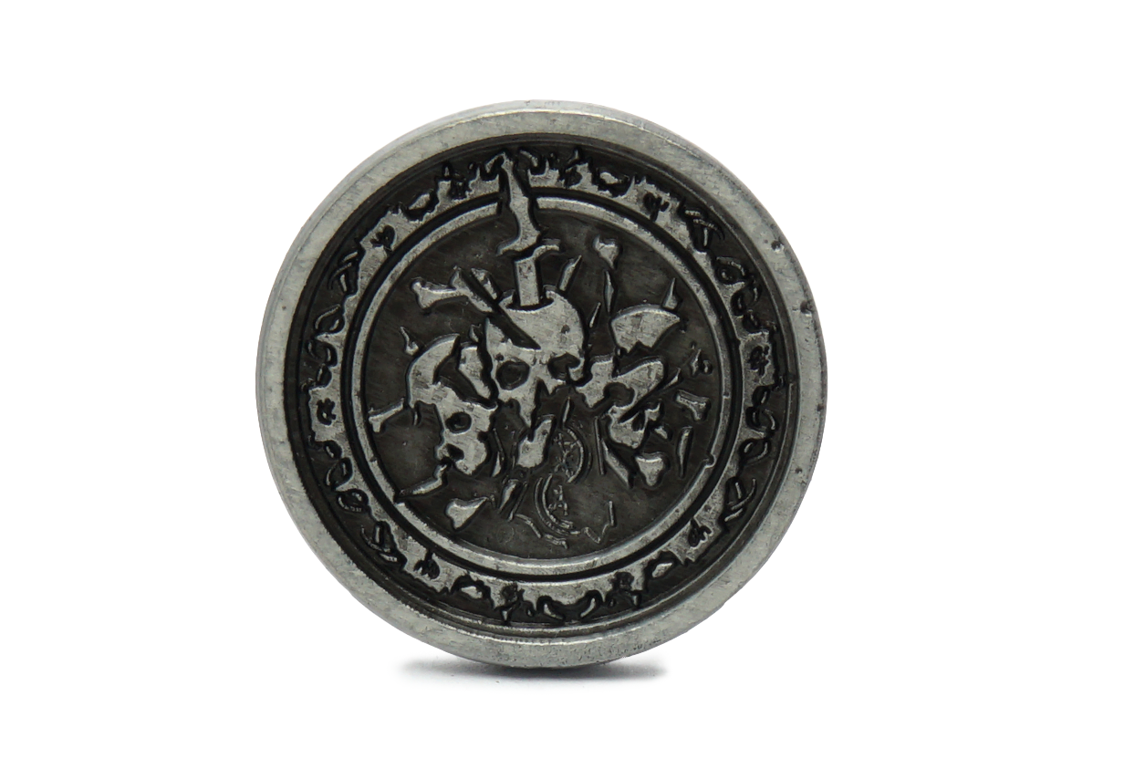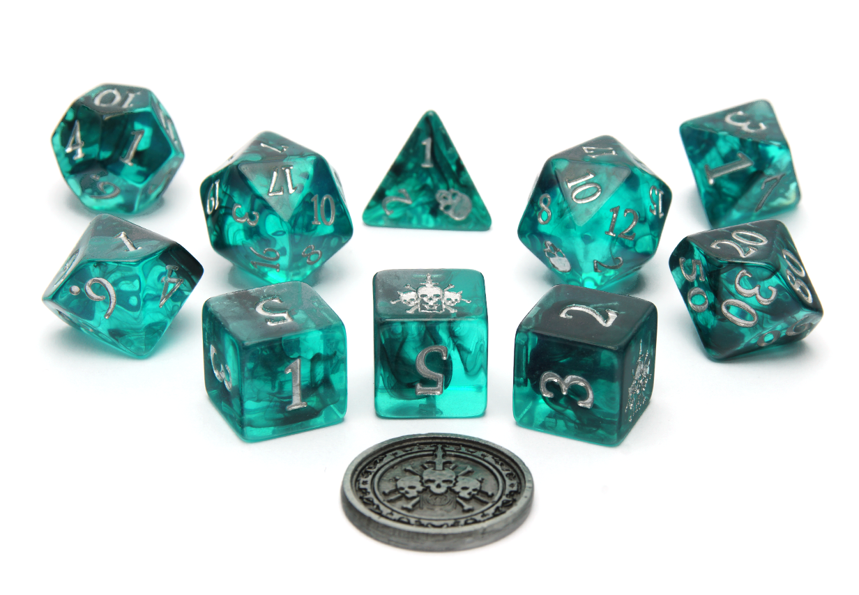 An eery transparent blue-green polyset with tendrils of smoky black shadows swirling beneath the surface. A glimpse into the underworld, inked with shining silver numerals and charismatic skulls!