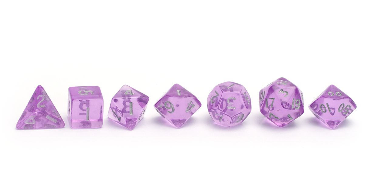 Crystal clear resin cast dice with silver numbering and vibrant colour. Ideal for new adventurers!