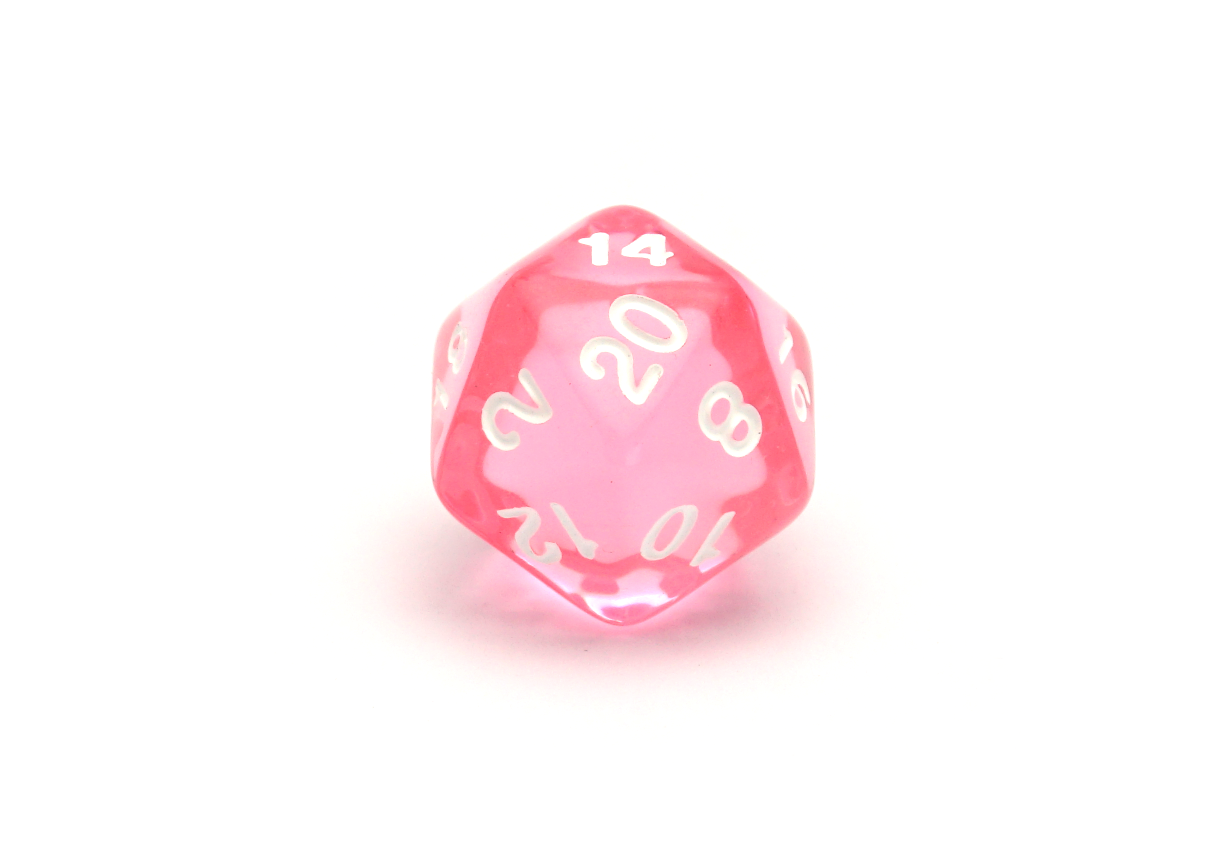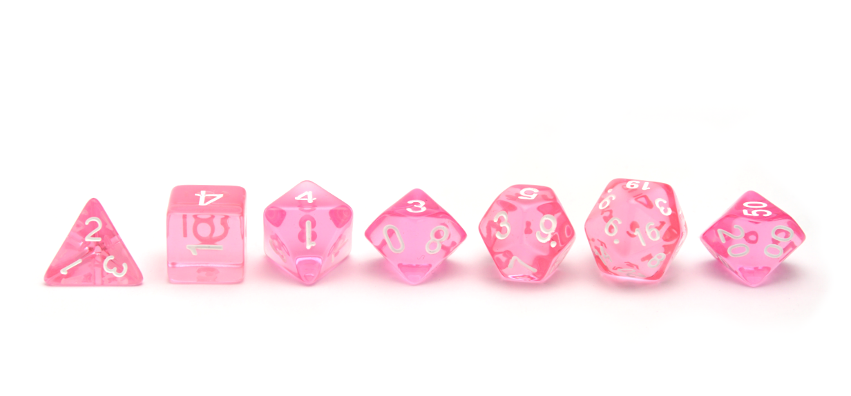 Crystal clear resin cast dice with crisp numbering and vibrant colour. Ideal for new adventurers!