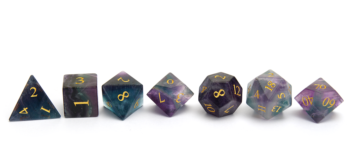 Made from real fluorite, these dice come in an array of beautiful and vibrant colours with each dice featuring gold numbering. No two dice are the same.