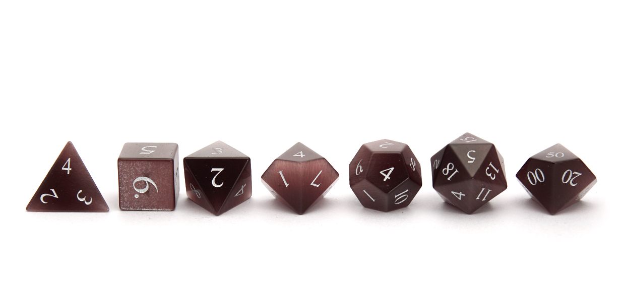 These beautiful Cat's Eye dice are truly mesmerizing to behold. Their purple-pink interiors catch the light in unpredictable ways, varying in hue and translucency as they roll.