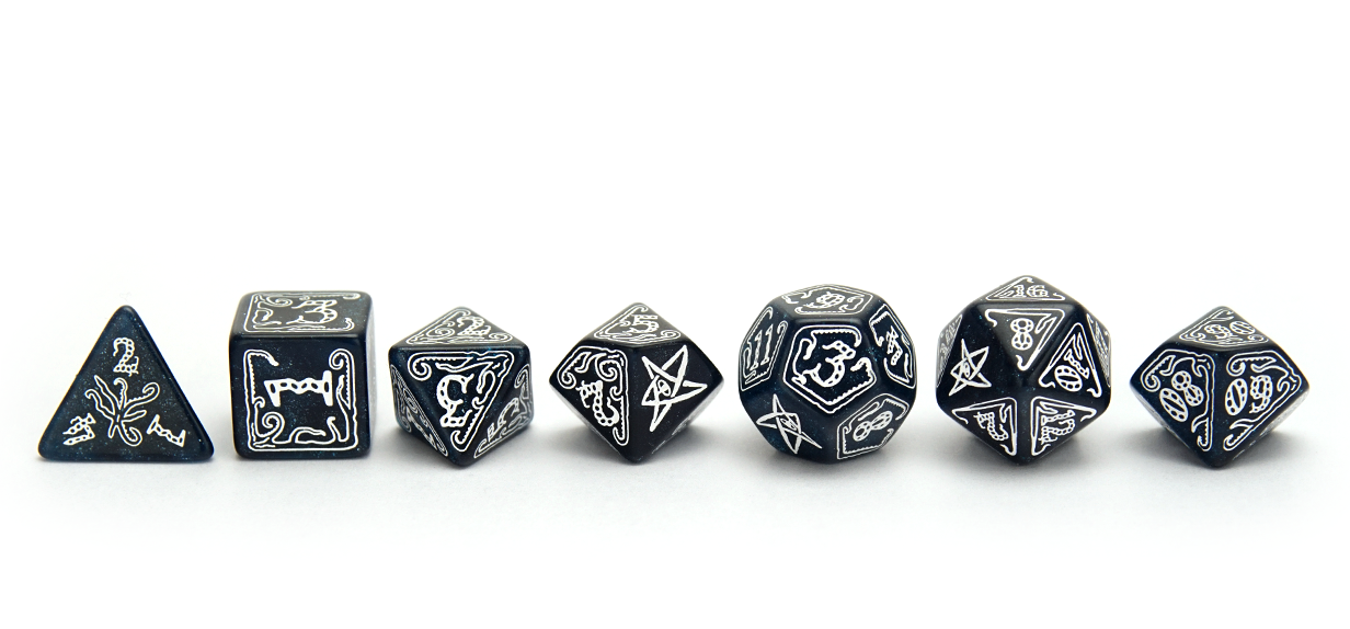 Alluring abyssal black dice with dazzling white inking and mesmerising lovecraftian imagery.
