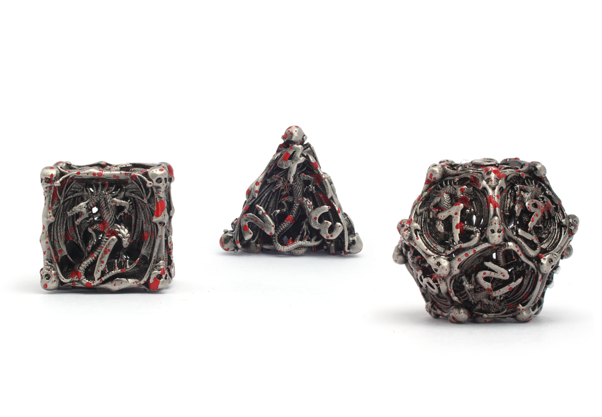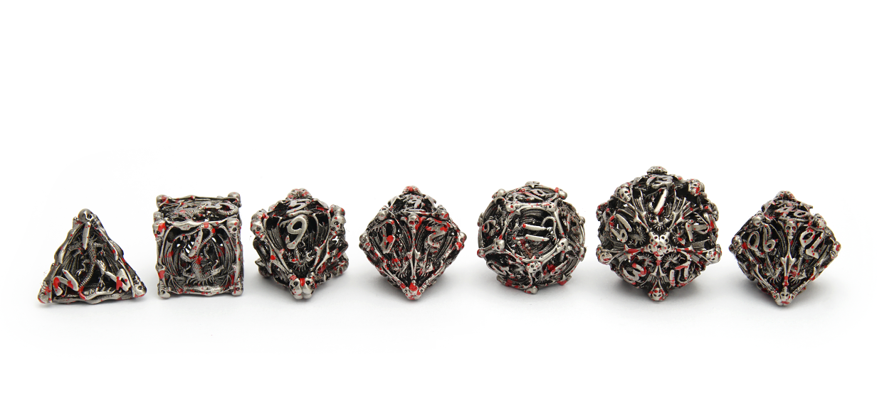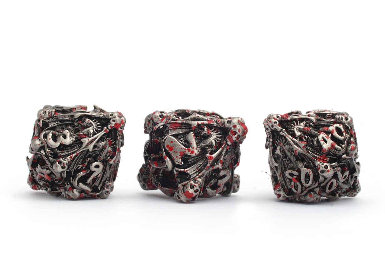 Silver in colour and spattered in blood red ink, these dice are a beautifully macabre marvel! A most grisly metal polyset, each die is hollow like the scattered bones and skulls that make up their shape.
