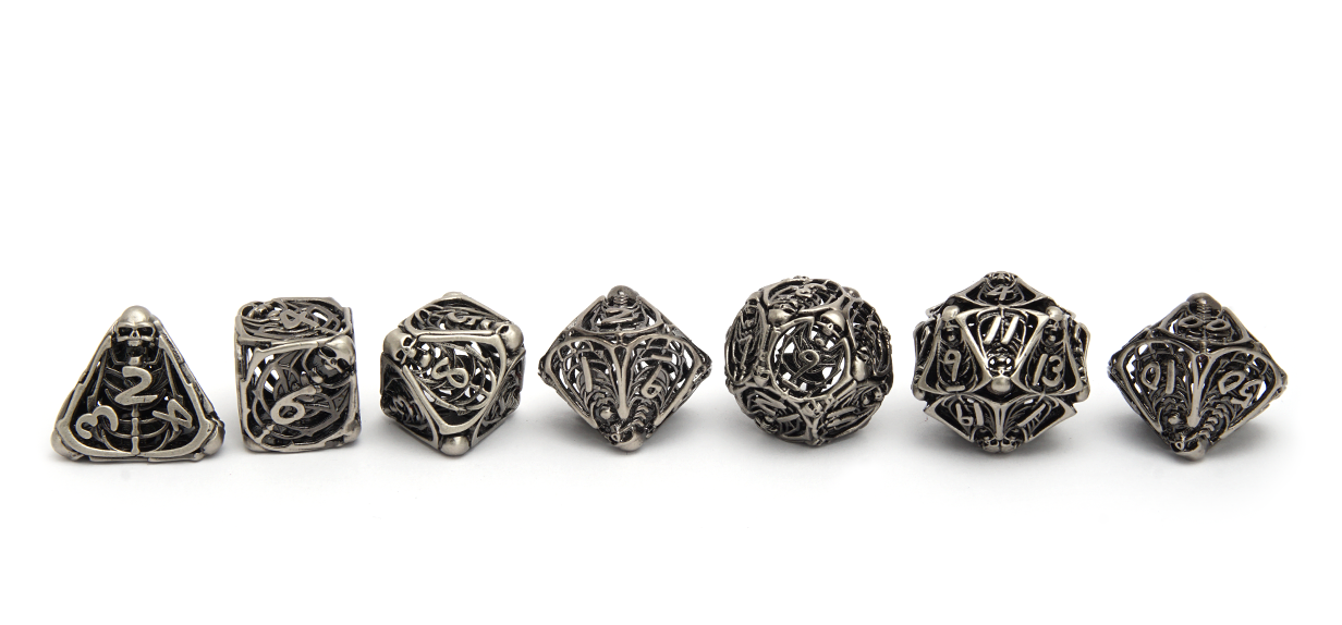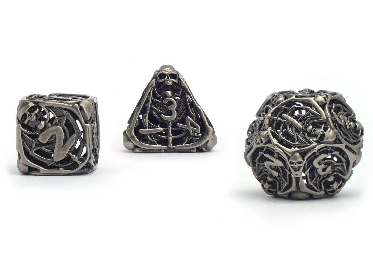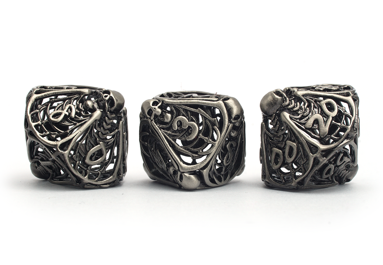 Each dice is as hollow as the bones that form their shape and roll with an eerie metallic jingle.
