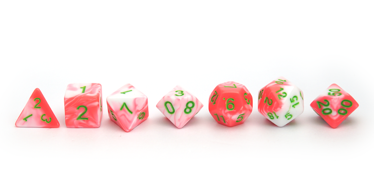 These pinkish red swirling dice with their distinctive green inking are reminiscent of a freshly cut watermelon.