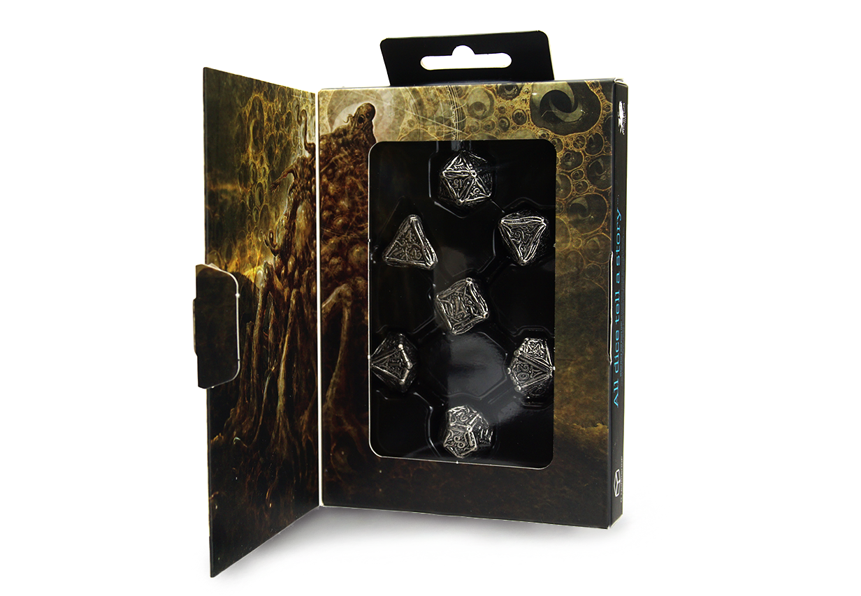 Proudly presented by Q-Workshop and Chaosium Inc. a metal dice set worthy of the Great Old One himself...