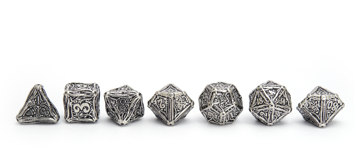These metal dice appear to have been summoned from another plane of existence, their twisted otherworldly design emanating madness, their sheer weight causing them to hit whatever surface they meet with a disturbing thud!