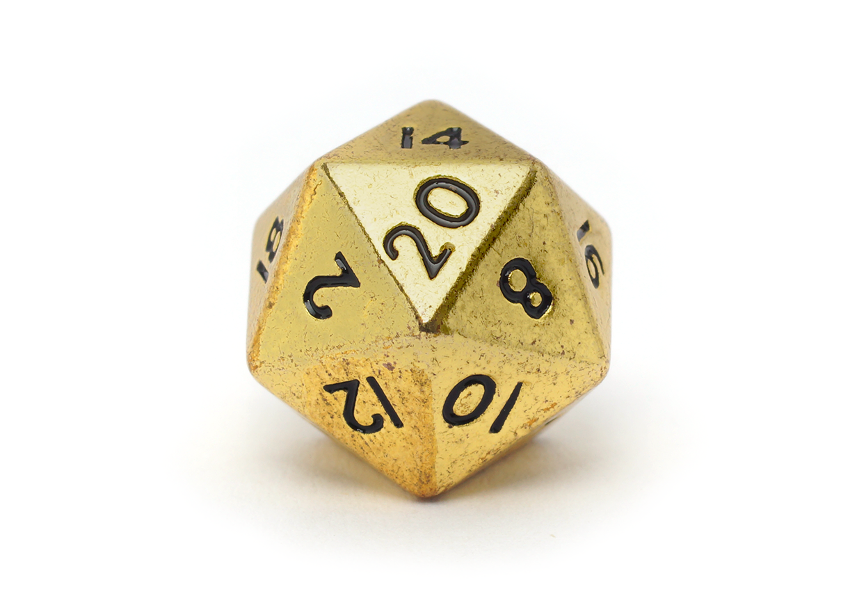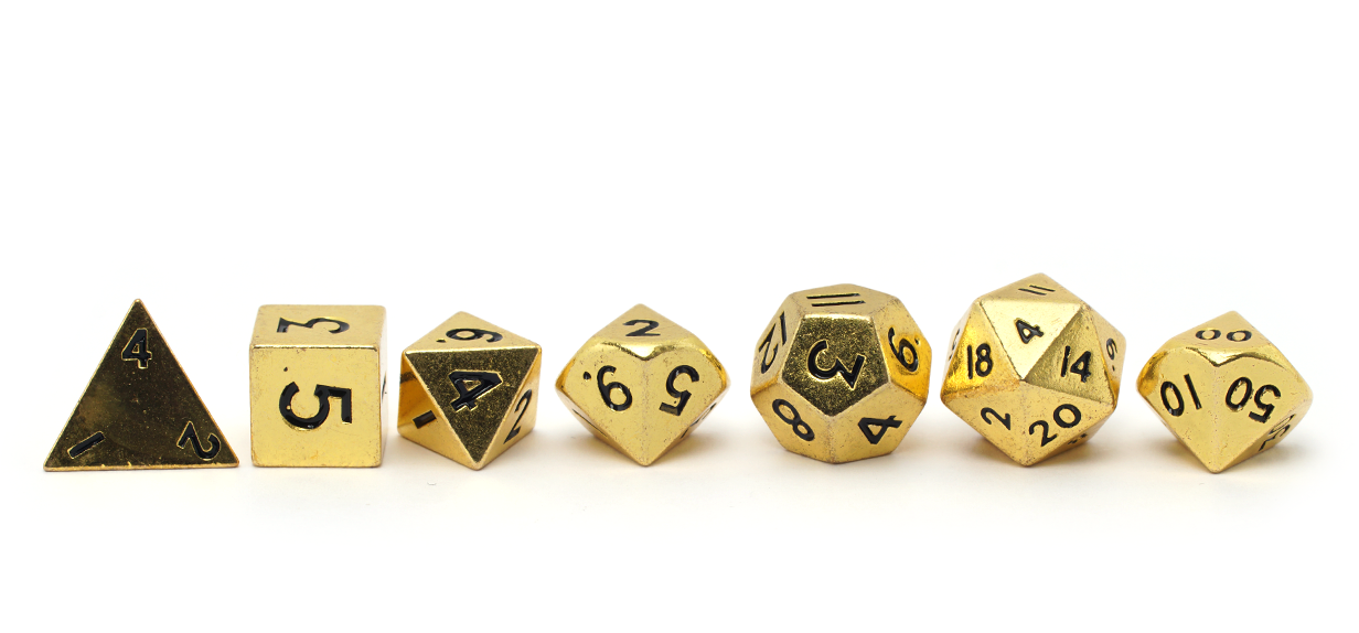 A brilliant gleaming golden machined metal polyset, in miniature! Still dense enough to roll with an impact, but less likely to leave a crater in your dice tray.