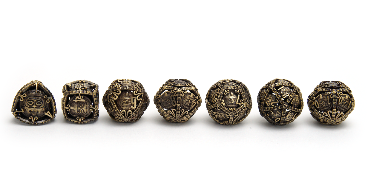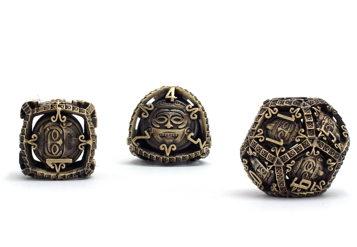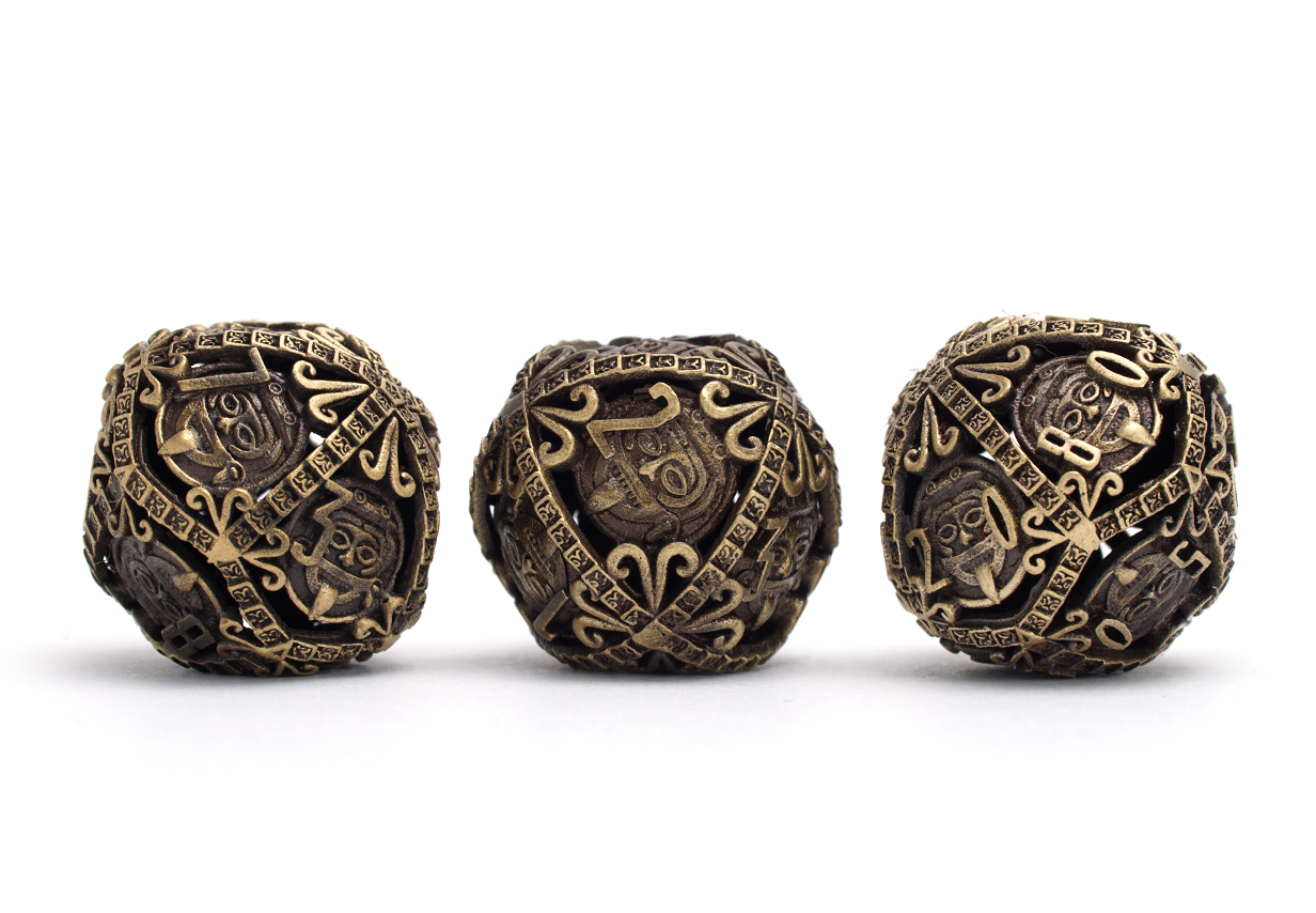 These impressive banded spherical dice are decorated with Maya imagery with a carved visage upon each face.