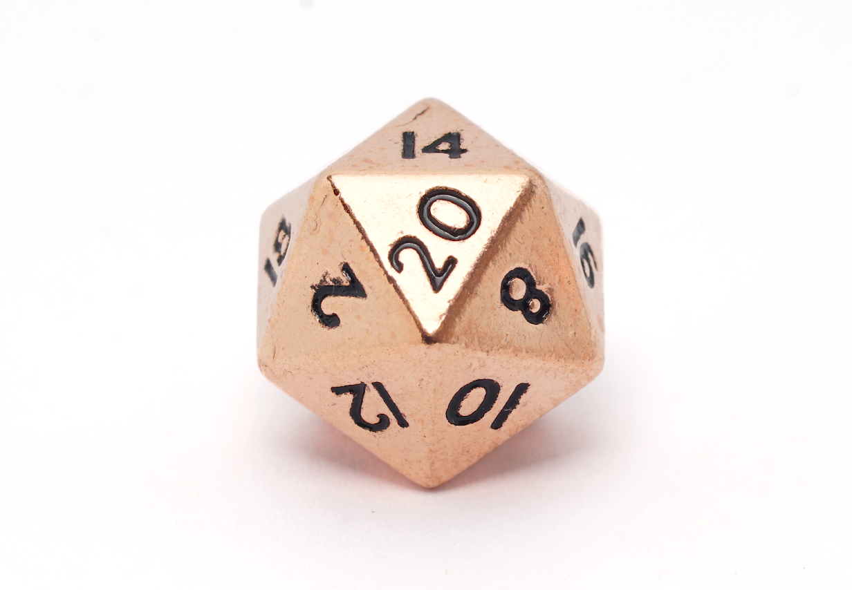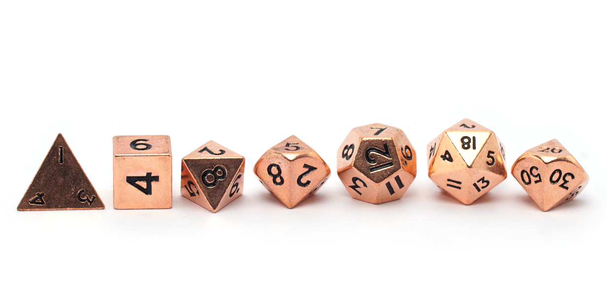 Glorious polished copper machined metal dice... now in miniature, so they're not as likely to leave a crater in your dice tray, but still dense enough to roll with an impact.