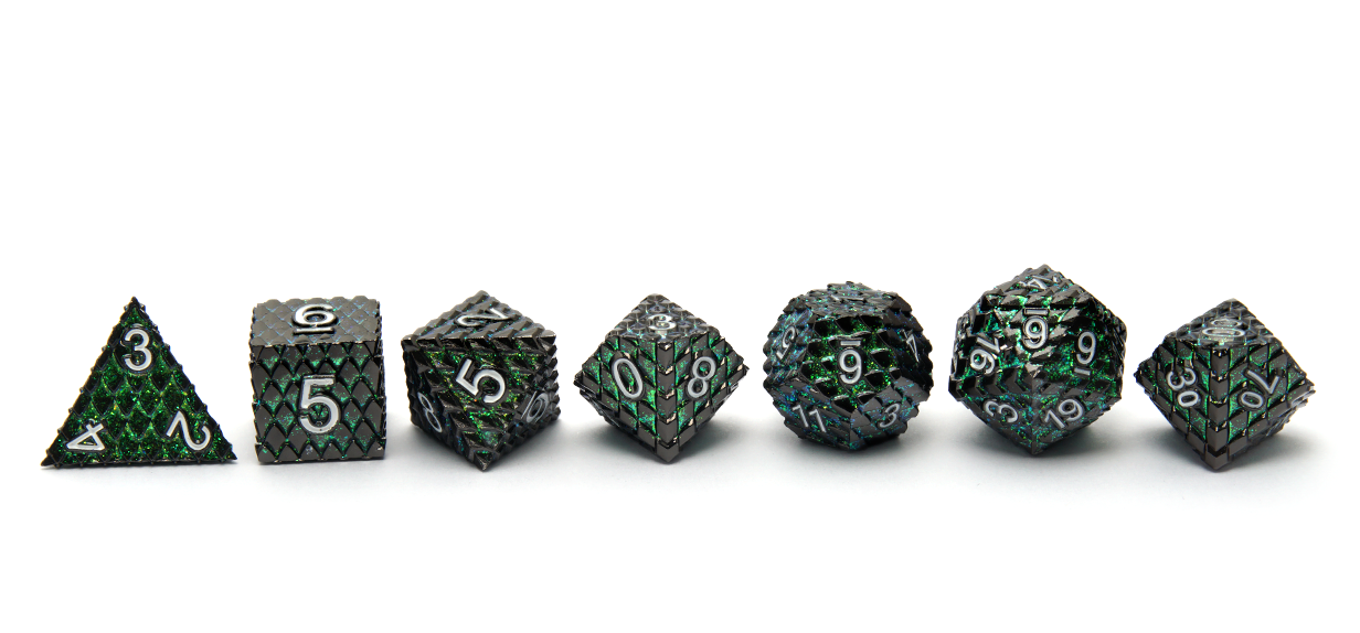 A high quality heavy metal polyset with a phalanx of black dragon scales and shimmering green enamel in between coating their entire surface.