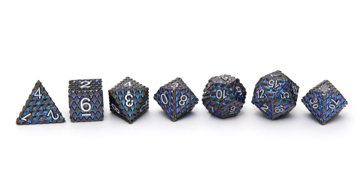 A high quality heavy metal polyset with a phalanx of black dragon scales and glittering saphire blue enamel in between coating their entire surface.