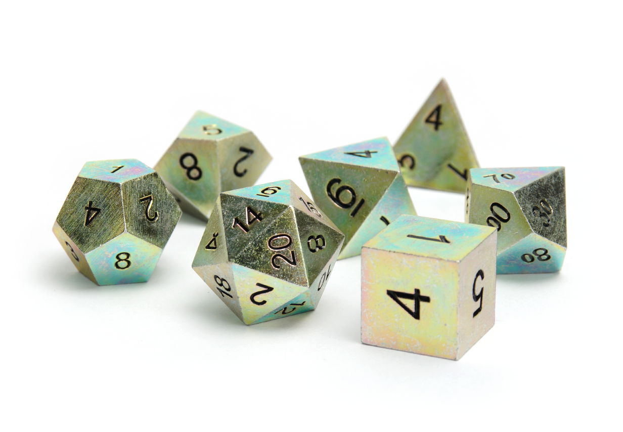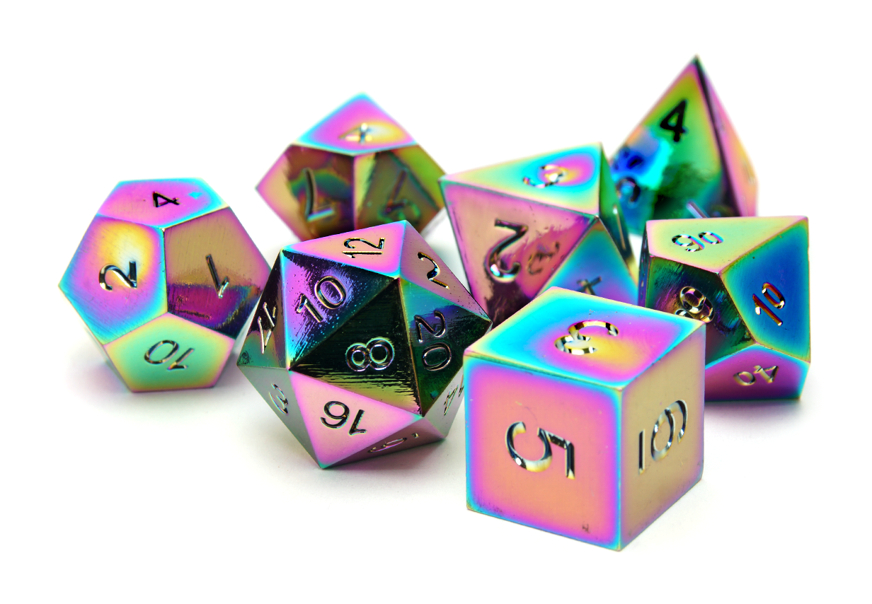 Some people enjoy lighter dice while others prefer the feel of power in their rolls. At DiceRoll UK we offer a growing selection of metal dice to suit all preferences and characters. Whether you’re a stealthy assassin wanting dice that leave an impression, or a cleric wanting their radiance to show, you’re sure to find a metal dice set to suit.