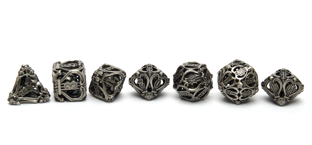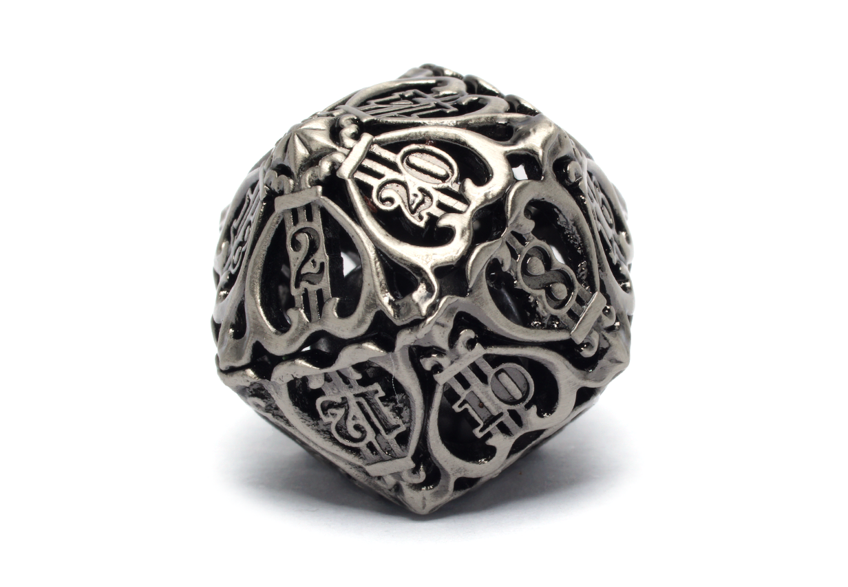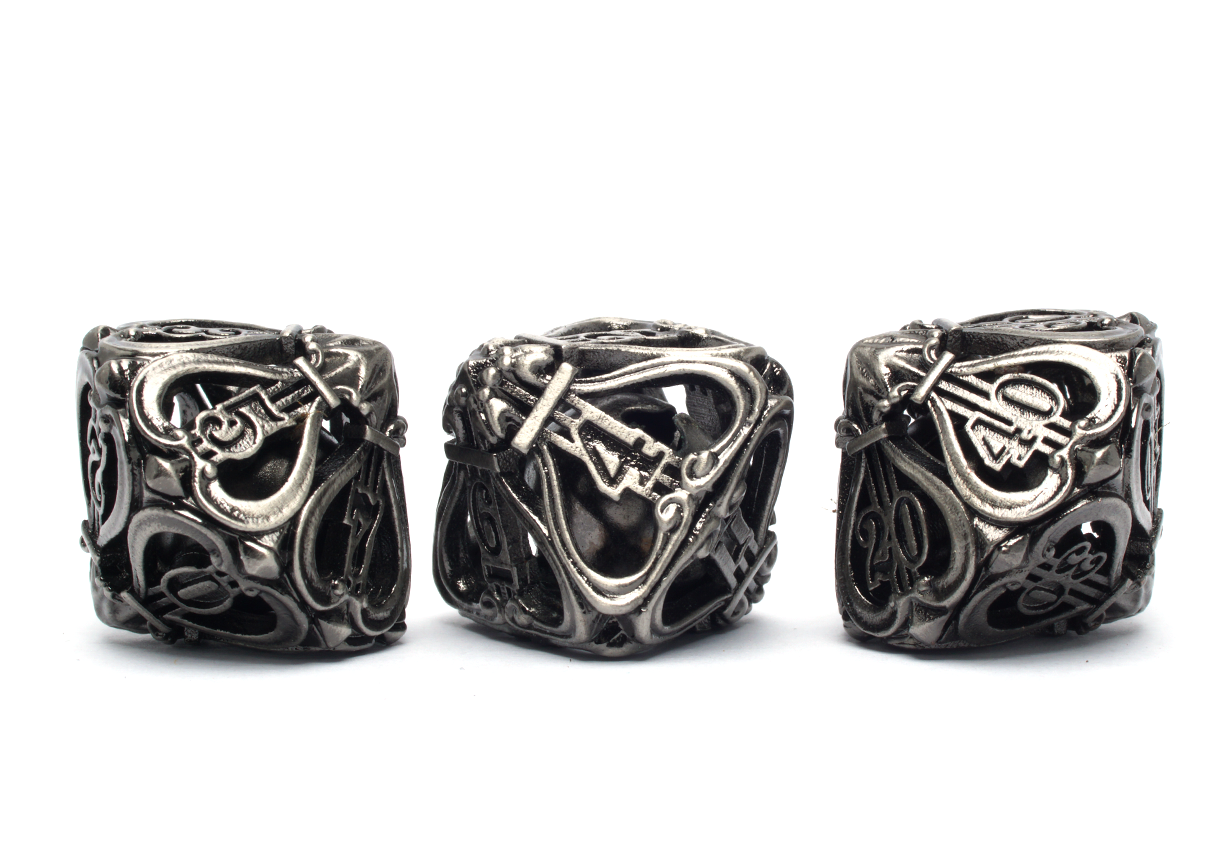 Flamboyant and musical hollow metal dice featuring bells that ring and jingle to accentuate every roll! And a charming design of interlocking lutes in smooth silver.
