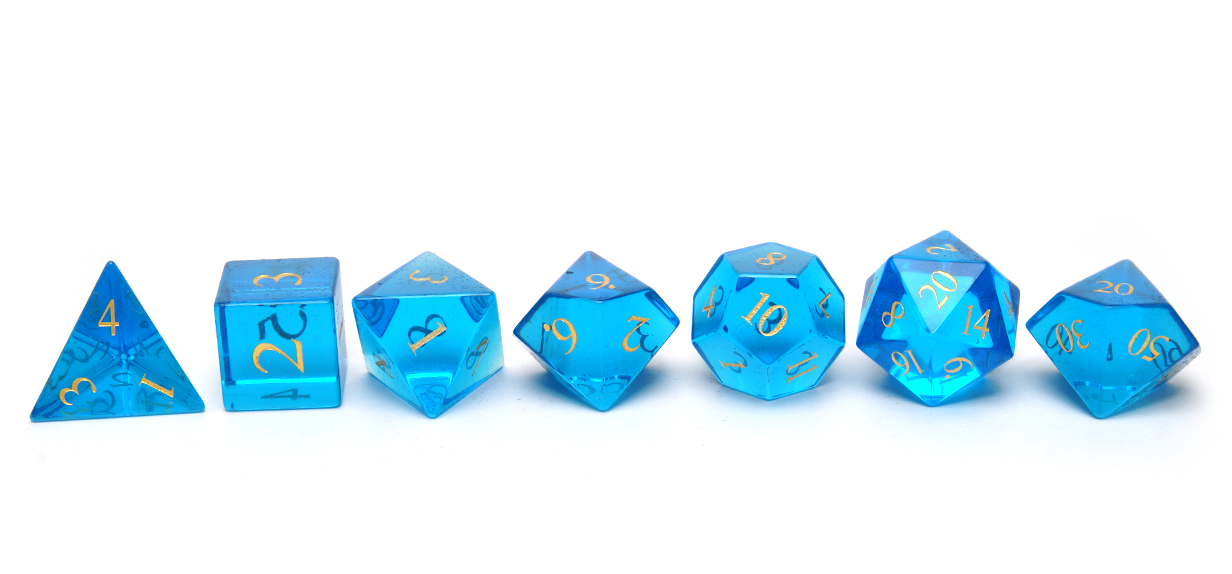 A polyset of beautiful crystal-clear aquamarine blue glass, topped with fine golden inking.
