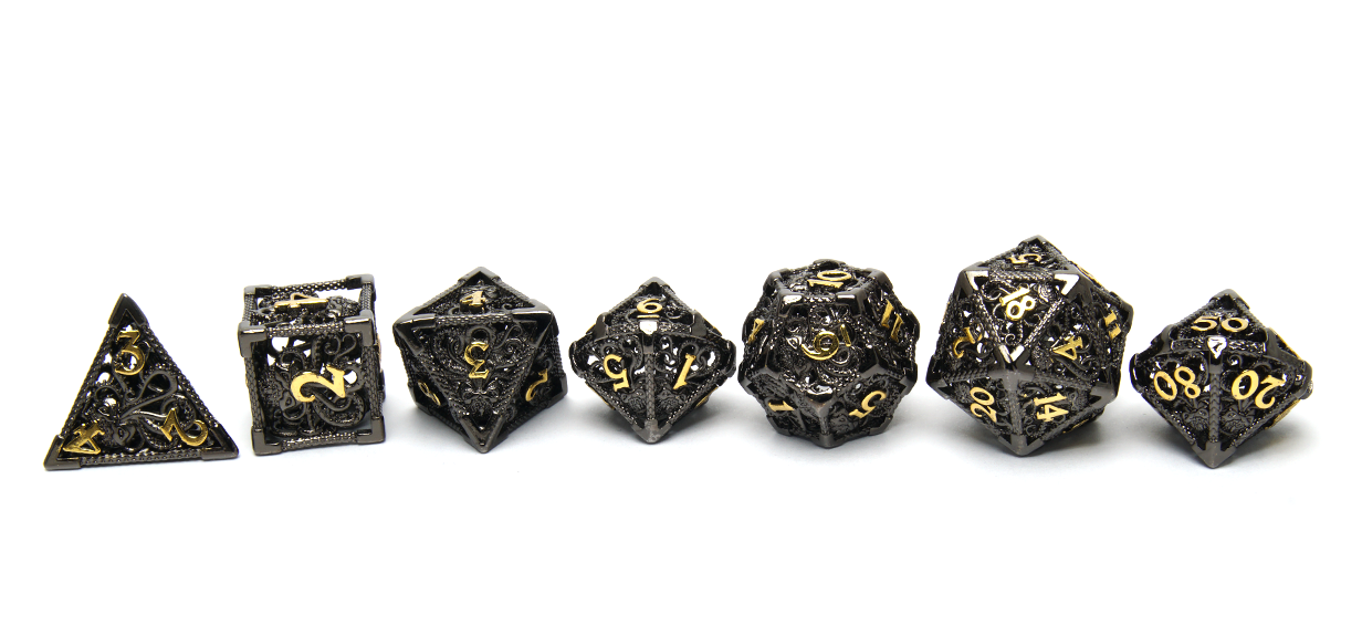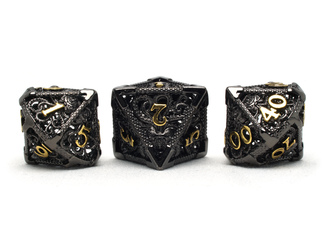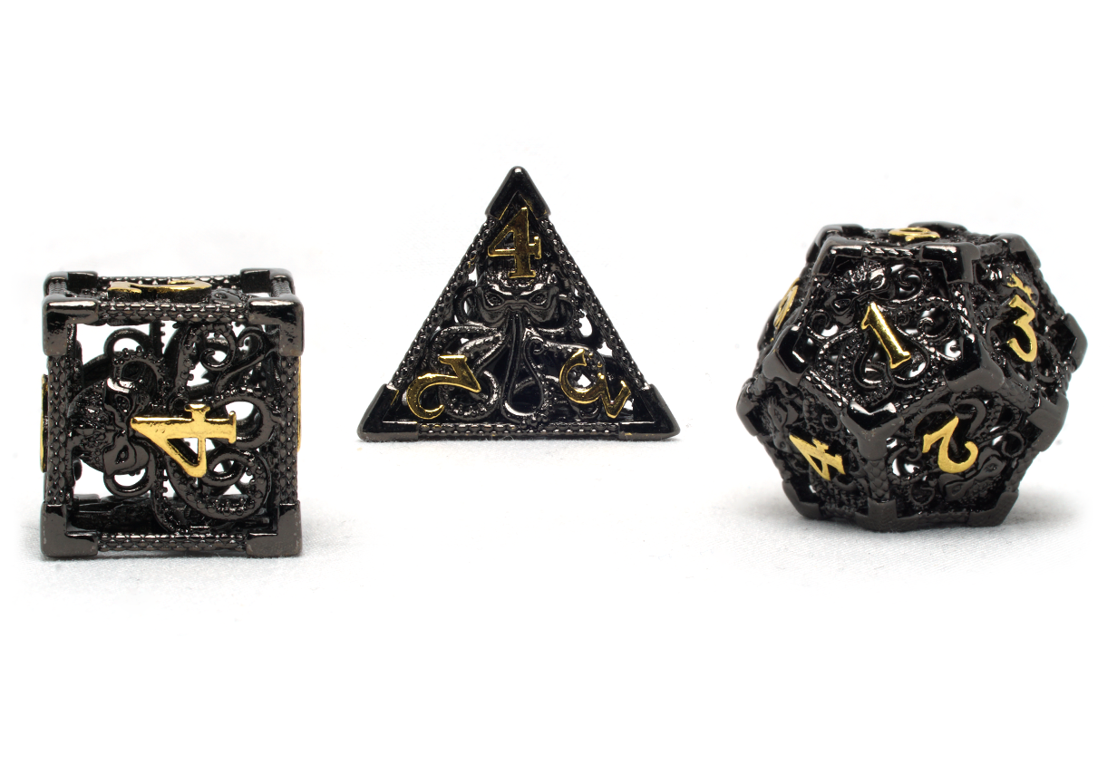Eerie but intricate metal caged dice with detailed depictions of the Great Old One himself on every face.