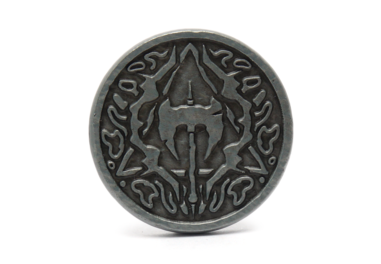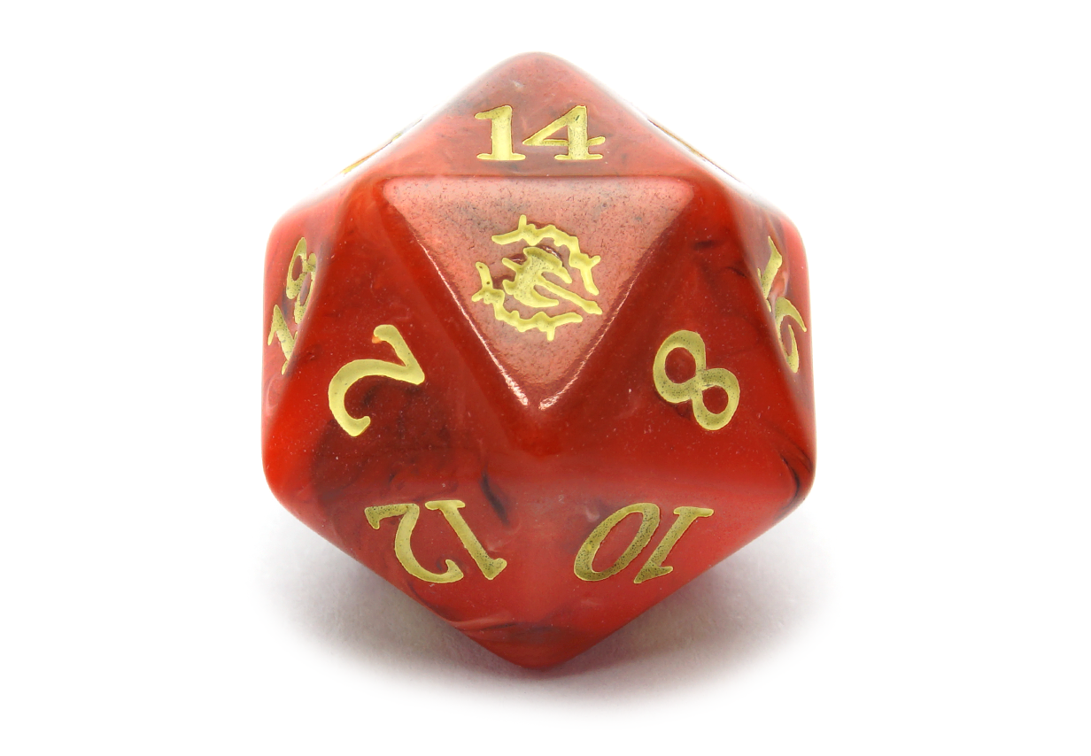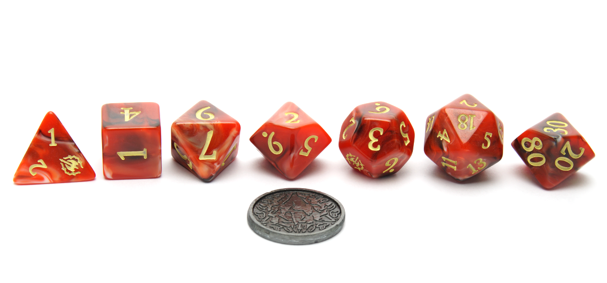 A high quality polyset of bloody gorgeous red and smoky black swirling resin decorated in enticing golden ink! In addition this set includes a silver metal coin token to further refine your fate.
