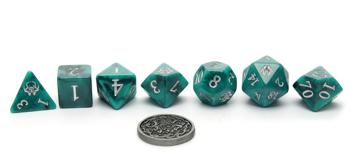 Verdant pine green and black dice, daubed in delicate silver ink, featuring a druidic antler emblem upon the highest values.