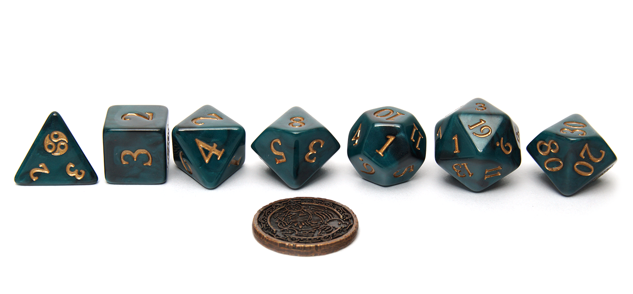 Regal green dice with a rich shadowy polish to them, decorated in unassuming copper-gold ink and featuring elemental symbols upon their highest values.