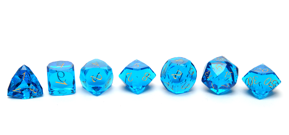 A magnificent glass polyset cut to look like aquamarine sapphire jewels, their mesmerising faceted surfaces twinkling as catch the light! Finished with fine golden ink.