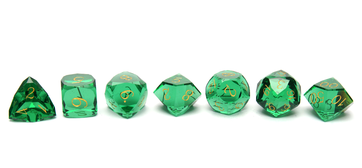 A magnificent glass polyset cut to look like real emerald jewels, their mesmerising faceted surfaces twinkling as catch the light! Finished with fine golden ink.