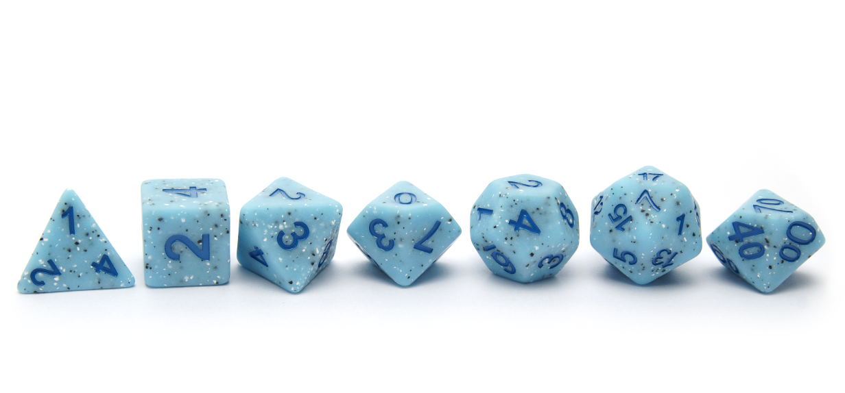 Soft blue speckled dice with a granite-like appearance, with sharp numbers inked in blue.