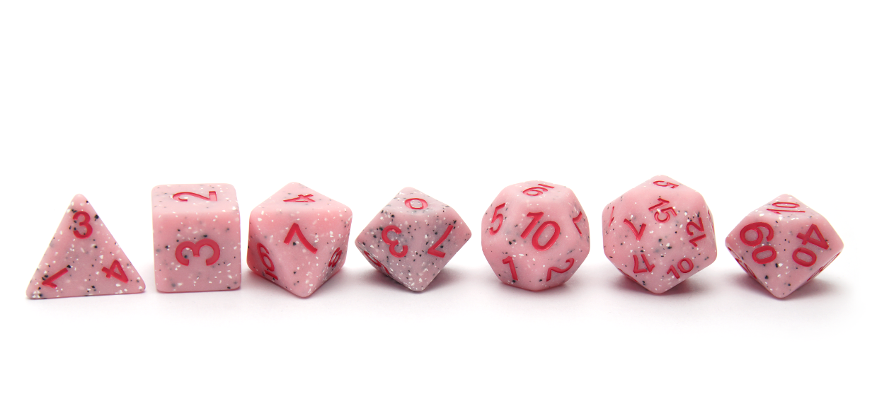 A pink hued granite looking dice, speckled with black and white, and inked with a vibrant red.