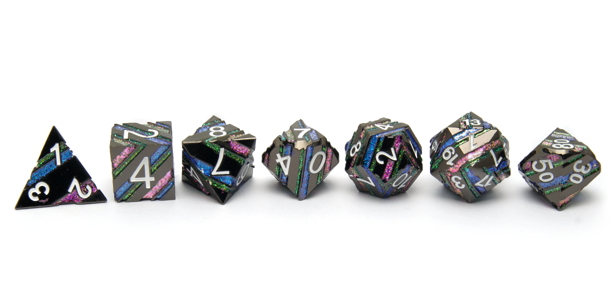 Enchanting black brushed metal dice with bands of glittering purple blue and green carved into them, like precious gems or veins of ore! The numerals are inked in fine white enamel paint. This premium metal polyset is sure to make an impression at your table!