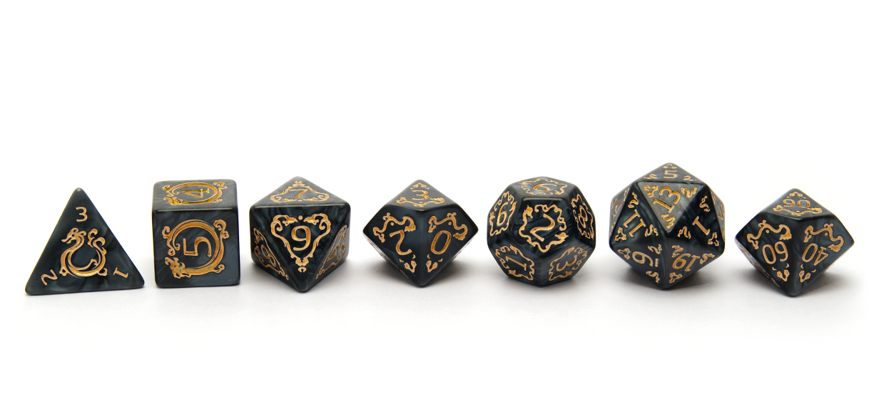 An alluring polyset of dark rippling blacks, emblazoned with draconic imagery filled in bold golden ink!