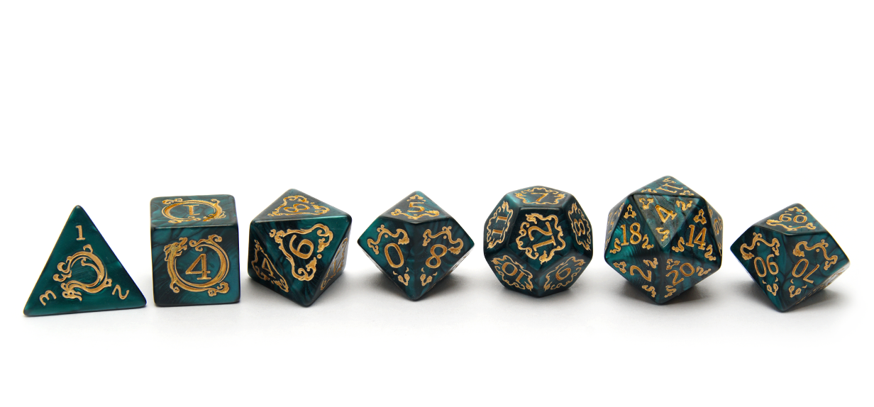 Exquisite dark green resin with regal carvings of draconic imagery filled in bold golden ink!