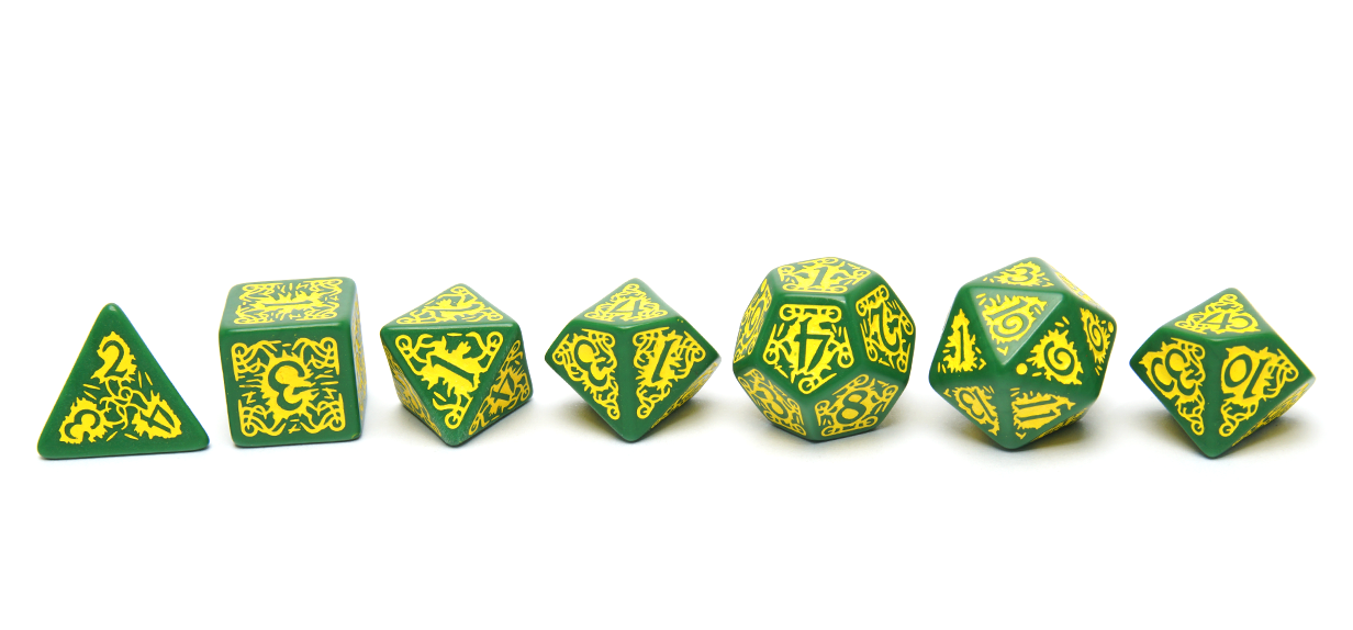 Paizo Inc. and Q-workshop are proud to bring you the 100%-official Pathfinder Strange Aeons Adventure Path dice. Each of these 7 adventerous dice bears designs suggestive of foul rituals and insanity. Roll the dice and claim your destiny!