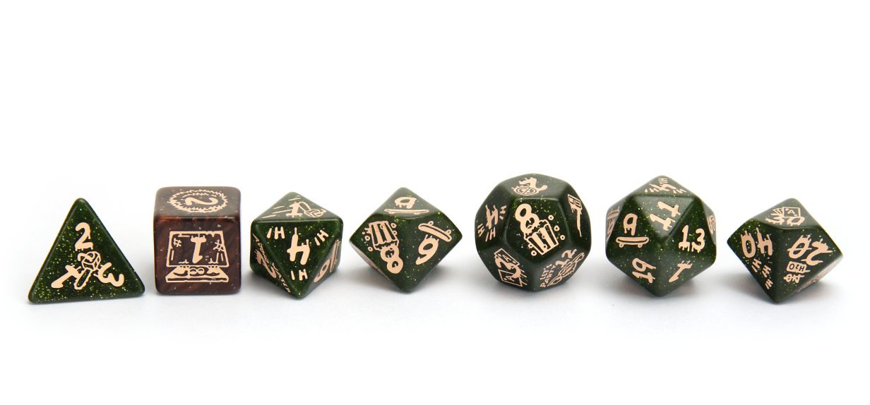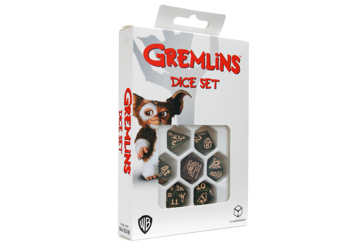 The official Gremlins franchise dice polyset in appropriately mischievous green with a unique red D6, and decorated in iconic mogwai and gremlin illustrations from the movies, all in bright yellow ink.