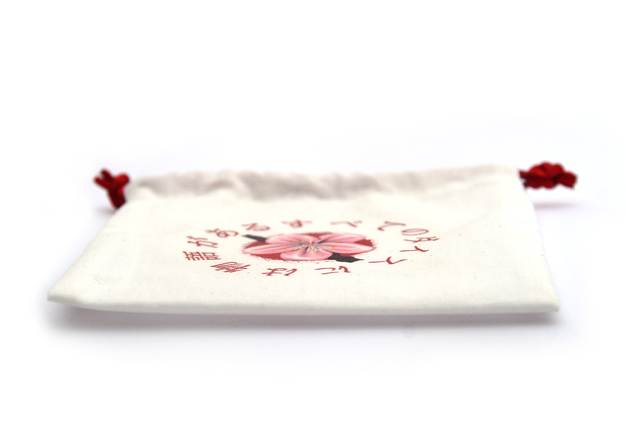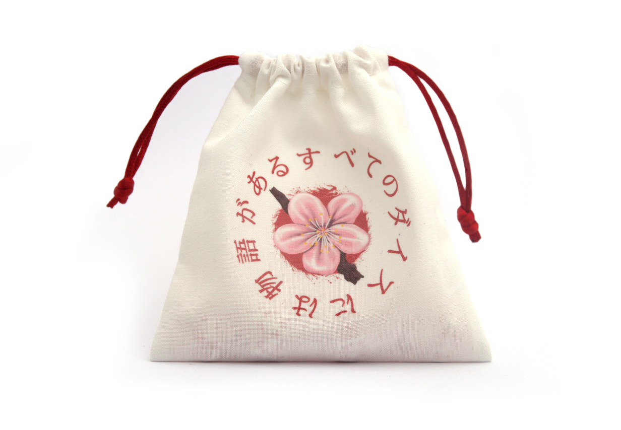 A sturdy but stylish oriental japanese themed drawstring dice bag decorated with a sakura (cherry blossom flower). The authentic japanese script reads "All Dice Tell a Story" which is the motto of designer Q-Workshop.