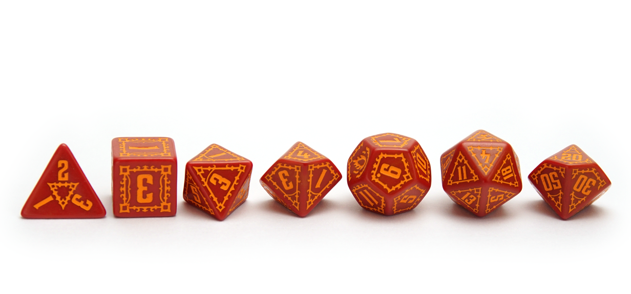 Striking crimson red dice featuring orange inked imagery and numerals, with a hurtling fireball emblazoned upon the highest values, ready to roll out apocalyptic destruction!
