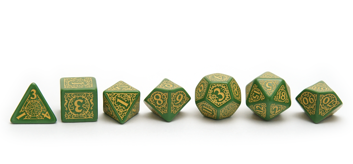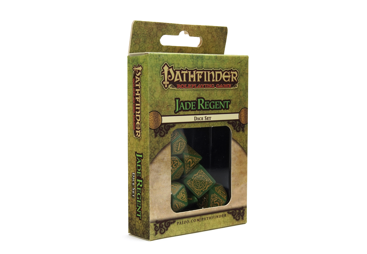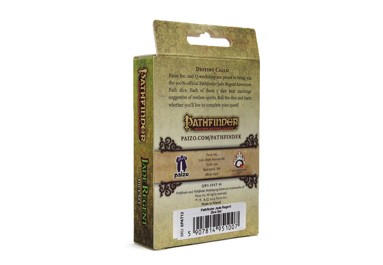 Paizo Inc. and Q-workshop are proud to bring you the 100%-official Pathfinder Jade Regent Adventure Path dice. Each of these 7 dice bear markings suggestive of restless spirits. Roll the dice and learn whether you'll live to complete your quest!