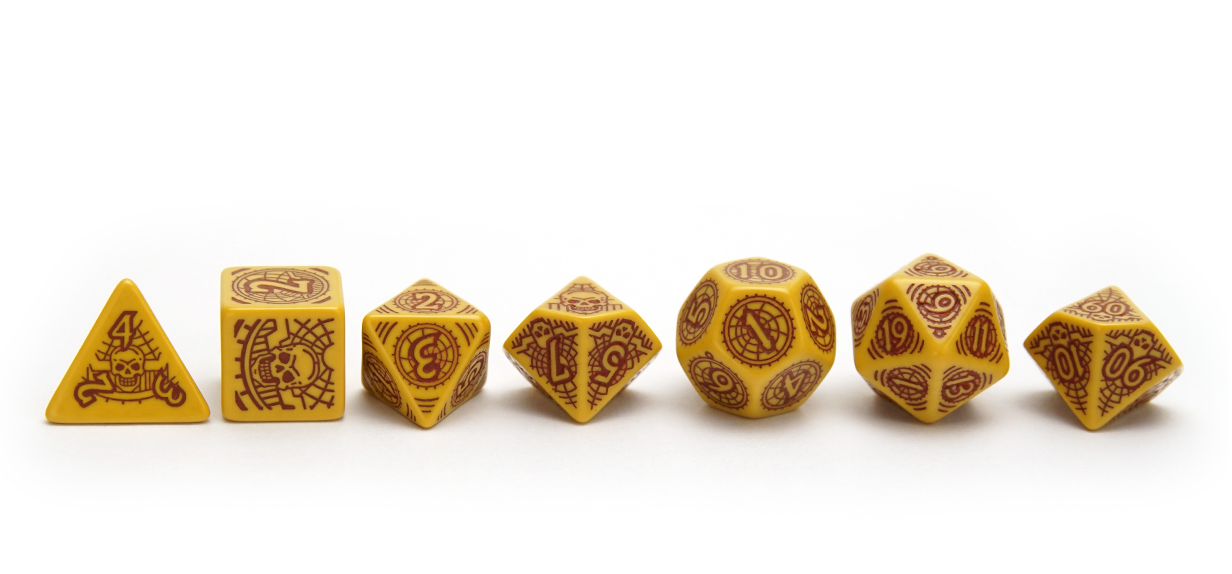 Bold golden yellow and daubed in crimson red ink, these dice are marked with nautical chart and globe decorations, with an intimidating skull proudly emblazoned upon the highest numbers.