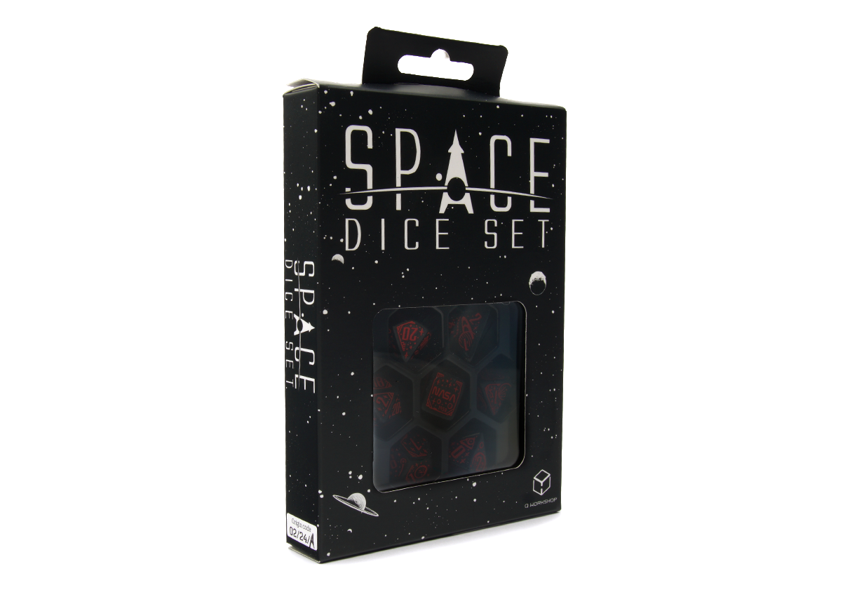 A stunning polyset featuring minute specks of fine glitter embedded within black resin, like stars in the night sky. Additionally they feature astronomical themed imagery as well as notable dates and symbols celebrating our journey beyond the final frontier!