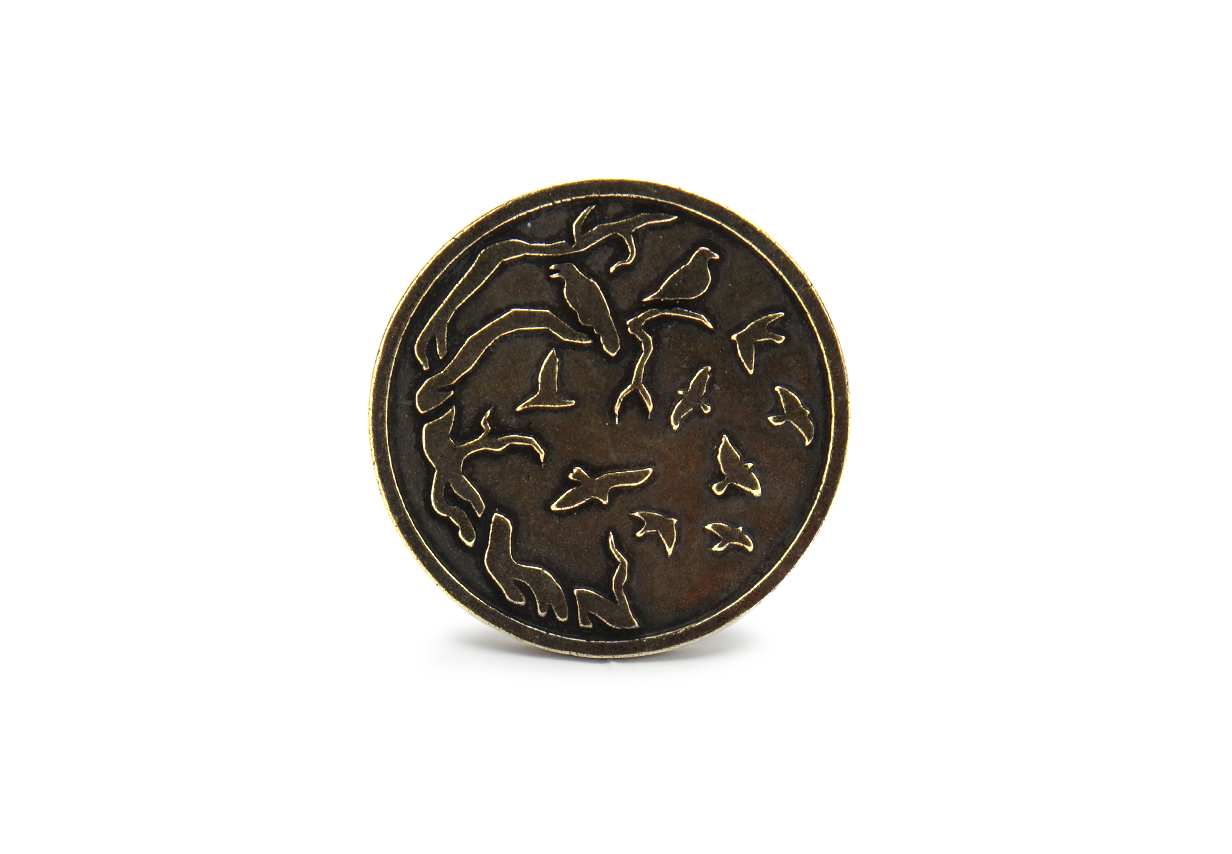 This creepy polyset of ivory and black ink features imagery of twisting wood with an antlered skull and crows featuring upon the highest values,