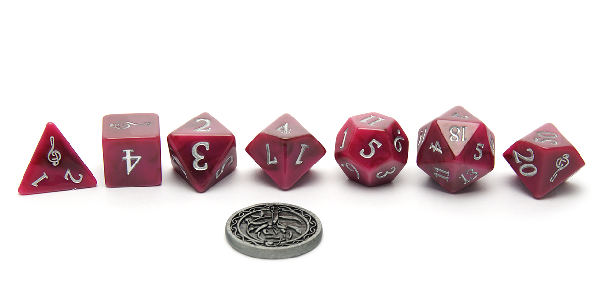 A high quality polyset of lustrous magenta hues and bold silver ink! This set also contains a silver metal coin as payment for your performance.