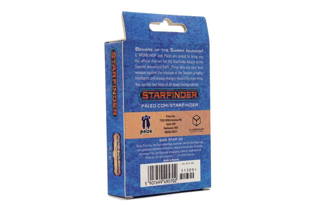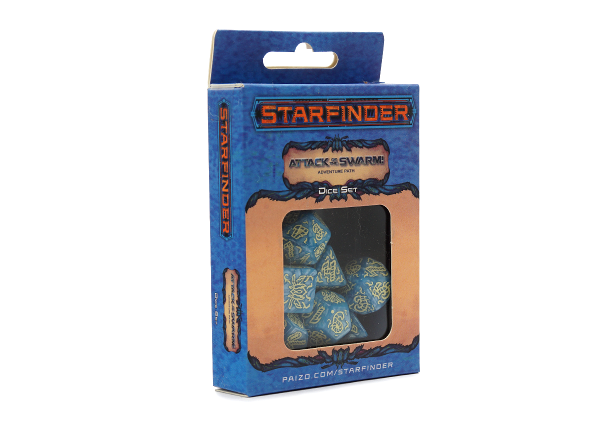 Q WORKSHOP and Paizo are proud to bring you the official dice set for the Starfinder Attack of the Swarm! Adventure Path. These dice are your best weapon against the invasion of the Swarm—a highly intelligent and always-hungry monolithic hive mind. You are the last hope of all peace-loving species!
