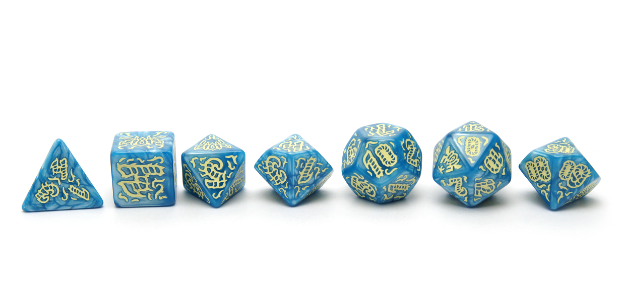A Starfinder themed polyset with hues of light blue plasma and vibrant electric yellow numbering in a dynamic cosmic font.