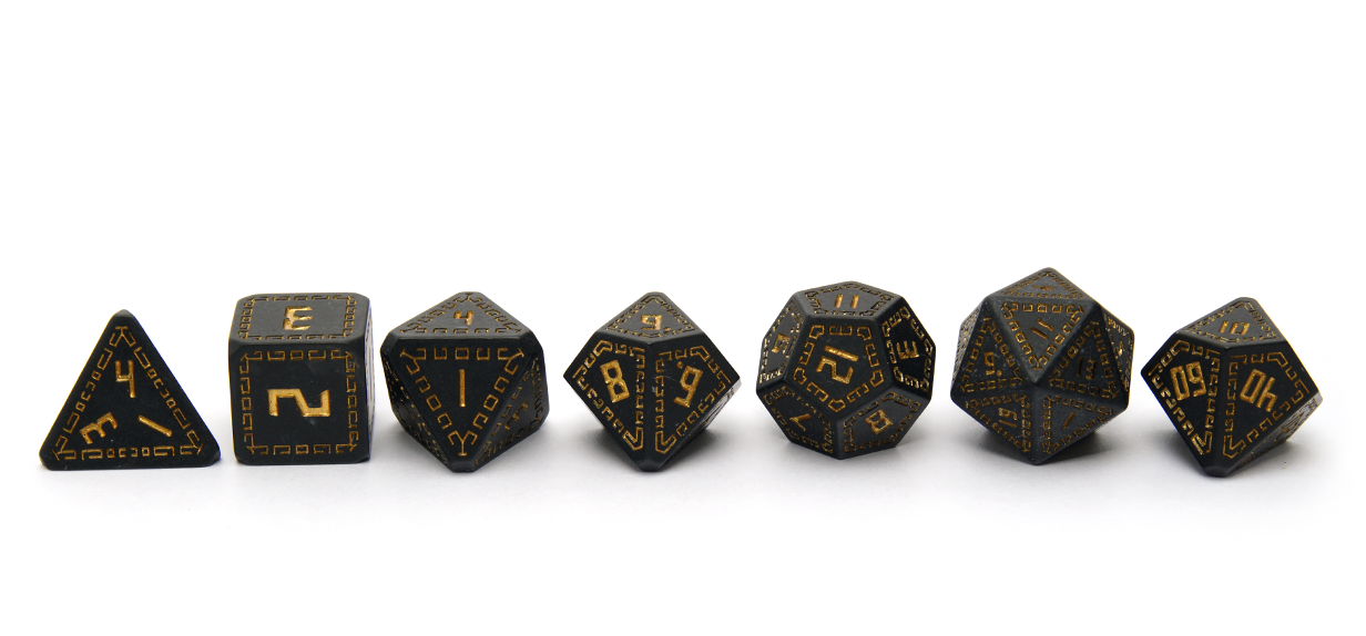 An ominous yet regal matte black resin polyset detailed with ornate gold ink. These dice offer fortunes favouring the darker side of the alignment chart and their golden filigree lavishings prove they have the power and influence to make them happen!