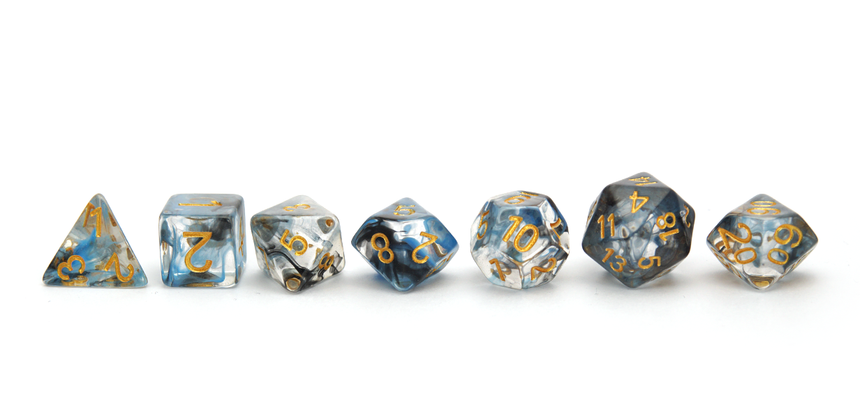 Turbulent spirals of ocean blue and abyssal black suspended in clear glassy resin. Marked with sharp golden numerals.