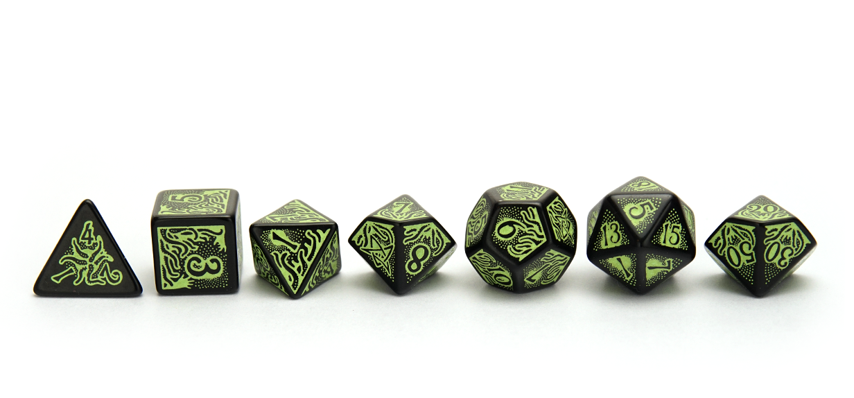 Stunning abyssal black dice with vibrant light green inking. This beautiful set by Q-Workshop is perfect for the Call of Cthulhu game, but it is also suitable for ANY other game.