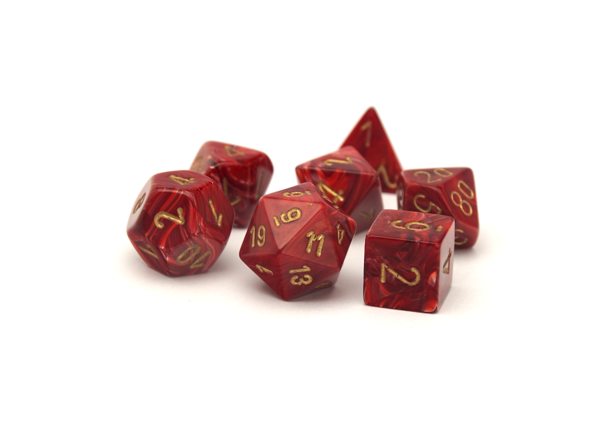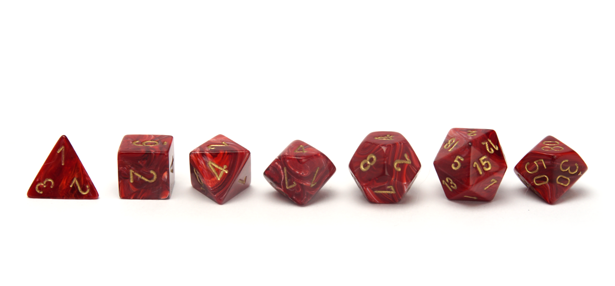 These dice are a deep red with just a hint of black and white, resembling a maelstrom of blood!